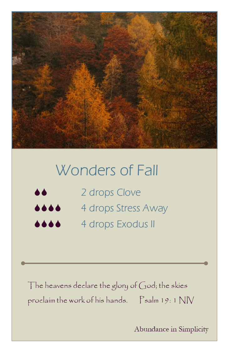 Wonderful diffuser blend for a crisp Fall day. A combination of Clove, Stress Away and Exodus II essential oils.