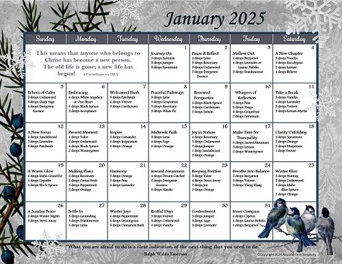 As we step into the new year, it’s the perfect time to embrace grounding, focus, and optimism for all the opportunities ahead.  What better way to support your intentions than with the soothing and inspiring benefits of aromatherapy?  To help you integrate essential oils into your daily routine, we’re excited to share our free Essential Oils Diffusing Calendar!  Each recipe is unique, personally tested, and designed to uplift your spirit, calm your mind, and enhance your focus.  Whether you’re seeking clarity for big plans, peace during busy moments, or just a little extra joy, these blends are here to support you.  Download the calendar today and discover how aromatherapy can help you feel balanced and energized all year long!