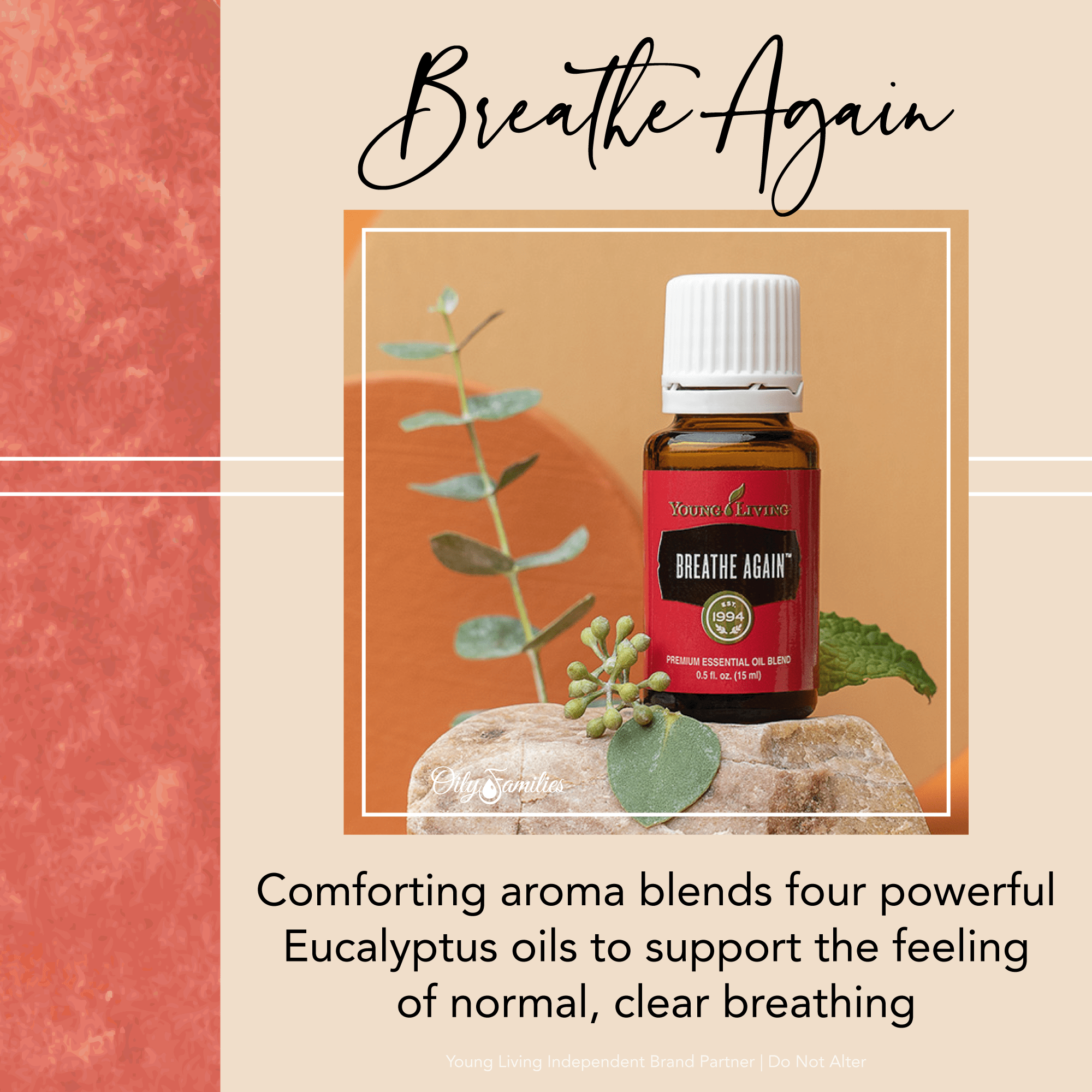 Carry the crisp scent of Breathe Again whenever you need to catch a breath from your busy day, whether you’re working up a sweat in the gym and want an invigorating boost, find yourself lagging at work and need a stimulating punch, or just need a break from stuffy odors anywhere life may take you. Breathe Again is just as easy to diffuse as it is to mix and blend with other Young Living essential oils to create custom concoctions. It combines some of Young Living’s most refreshing essential oils—including four different types of Eucalyptus—for a powerful, rejuvenating essential oil. In addition to various types of Eucalyptus, Breathe Again includes Blue Cypress, which is steam distilled from the leaves and wood of the blue cypress, a tree indigenous to Australia. It also includes Copaiba, which comes from the resin of the Brazilian Copaifera reticulata tree. With these potent essential oils, Peppermint, Myrtle, and more, Breathe Again is a must-have any time you’re in need of a refreshing experience.