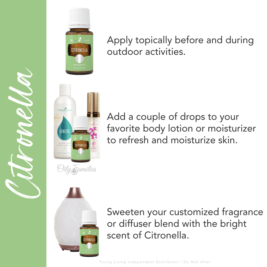 Combine Citronella with Lemongrass and Cedarwood essential oils in a spray bottle and top off with water or alcohol-free witch hazel to create an outdoor spray.