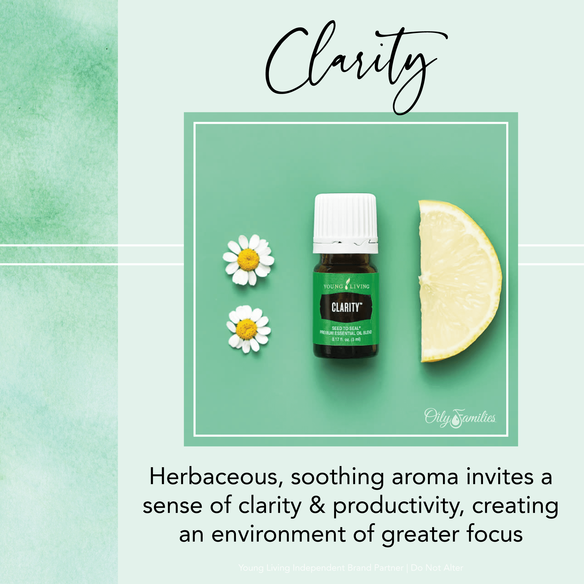 - Dilute Clarity with V-6 Vegetable Oil Complex and apply it to the back of the neck and temples to create an atmosphere conducive to work or study.