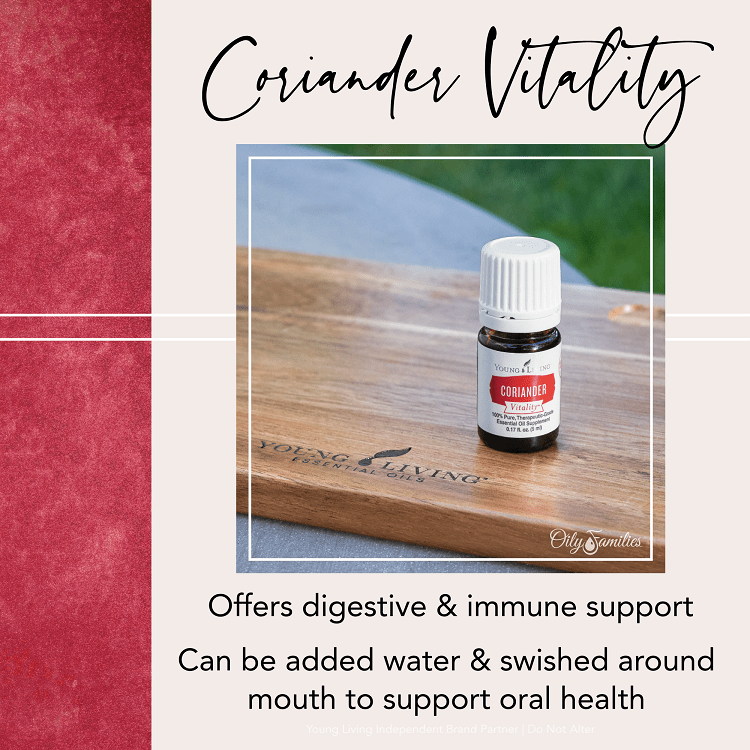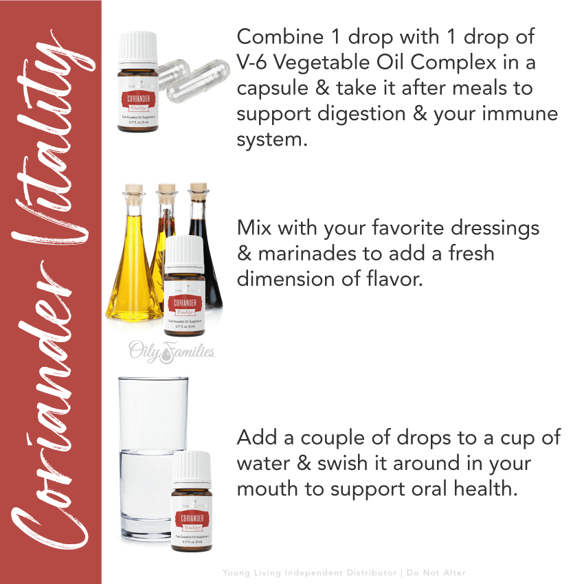- Dilute 1 drop Coriander Vitality with 1 drop carrier oil. Put in a capsule and take up to 3 times daily or as needed.