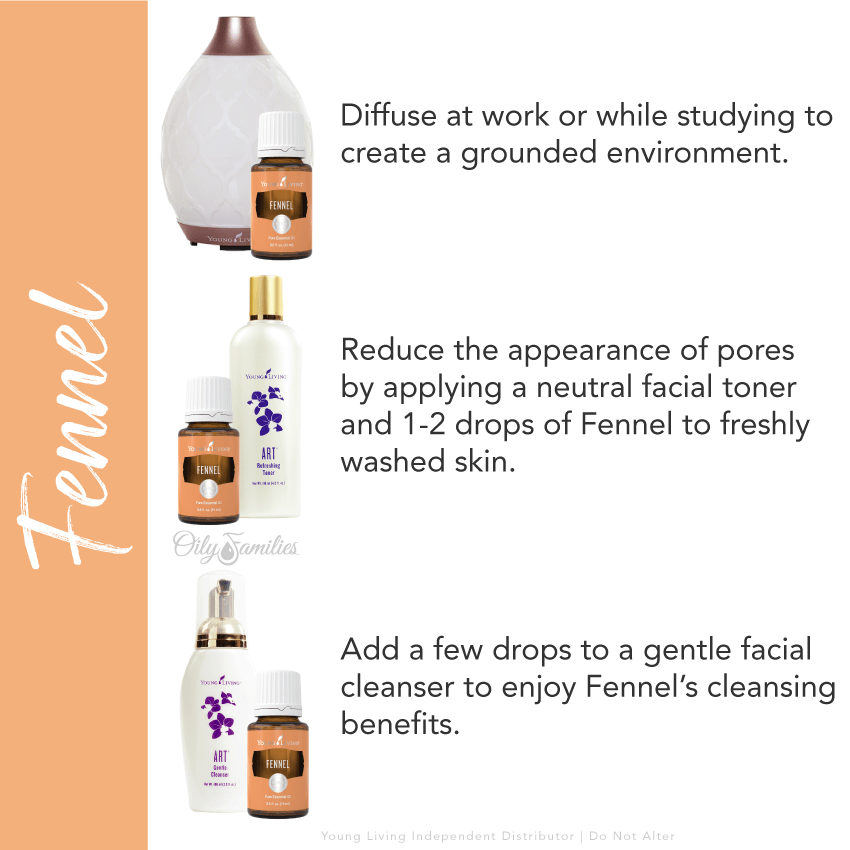 Fennel essential oil has a comforting and balancing licorice-like aroma.  Taken internally, it supports a healthy digestive system and overall well-being.*  It is steam distilled from the crushed seeds of the fennel plant. The leafy herb is native to regions of southern Europe and Asia Minor, but it has since naturalized in locations around the world.  Fennel has a rich aroma reminiscent of anise, which gives Fennel essential oil its licorice-like scent.  Although the seeds and oil are used in flavoring, Fennel’s complex aroma has also made it popular in soaps, candles, and perfumes.  There are many uses for Fennel, but the oil is popularly used for aromatic applications. Its sweet, spicy aroma has a long history of encouraging grounding feelings, making it an important part of Young Living’s Dragon Time™ Massage Oil and Prenolone® Plus Body Cream.