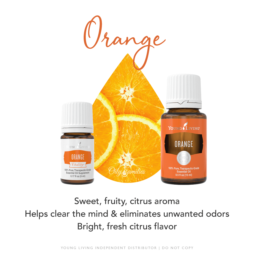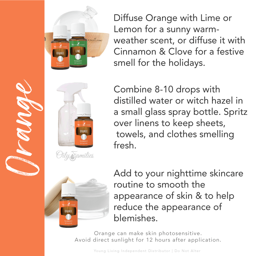 • Diffuse Orange with Lime, Lemon, or Tangerine oil for a sunny, refreshing aroma, or with Cinnamon and Clove oils for a cozy, festive smell.