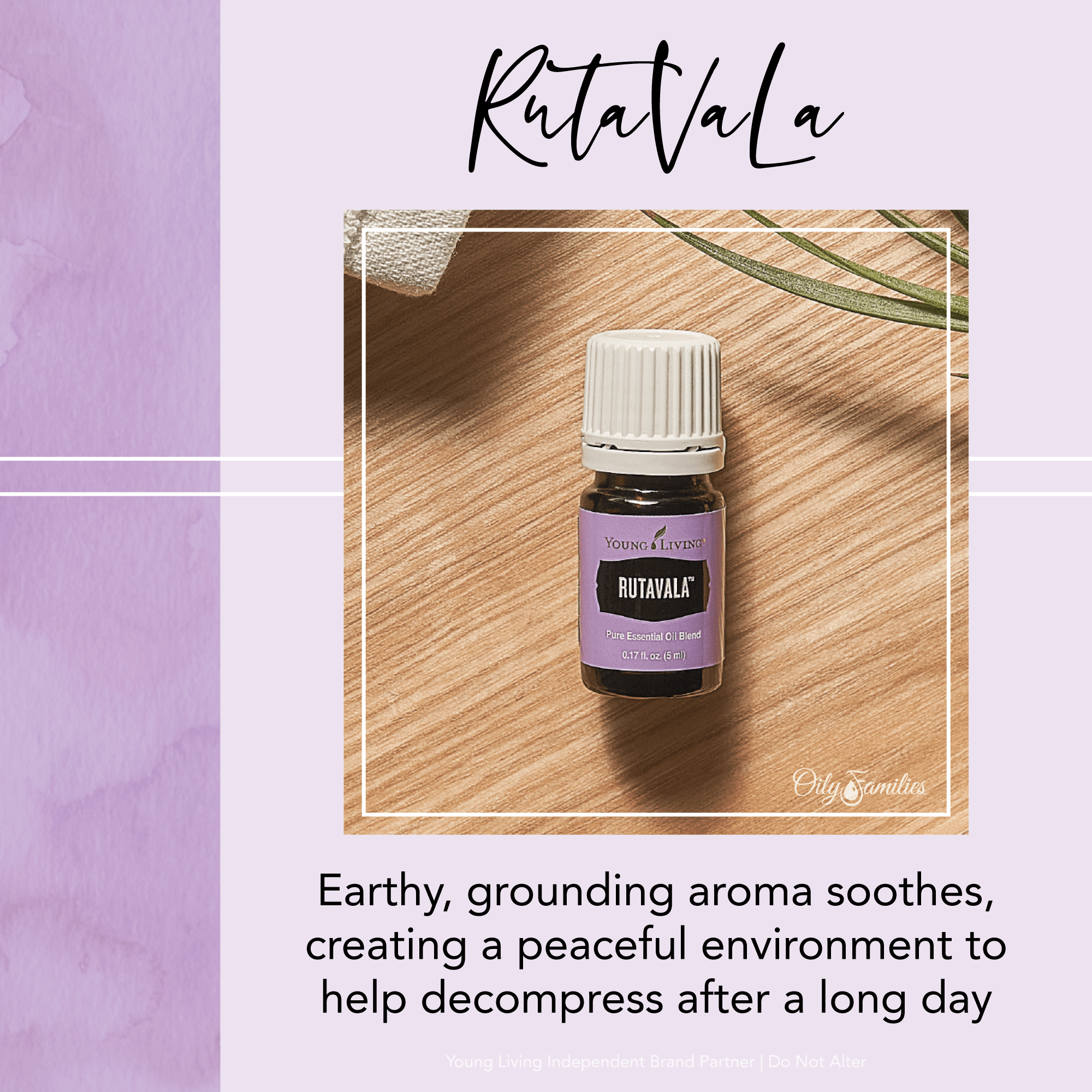 Formulated by Young Living Founder D. Gary Young, RutaVaLa combines three essential oils that are great for helping you create a sense of calm in your life. With its earthy, grounding aroma, RutaVaLa can create a peaceful environment. This blend has a reputation for its “interesting” aroma. It may not be your favorite scent, yet how you feel when experiencing it is worth it!