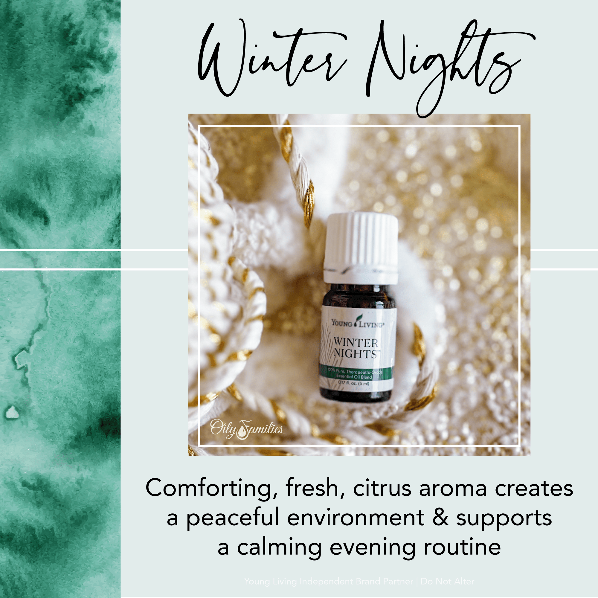 Winter Nights™ essential oil blend combines the cool, inviting scents of Northern Lights Black Spruce, Peppermint, Cedarwood, and Orange. The aroma of Winter Nights invigorates any home with the electricity of softly falling snow, the peace of crisp midnight air in winter, and the warmth of cozy spaces. This blend is a perfect complement to Young Living’s Winter Nights Foaming Hand Soap and Lotion.