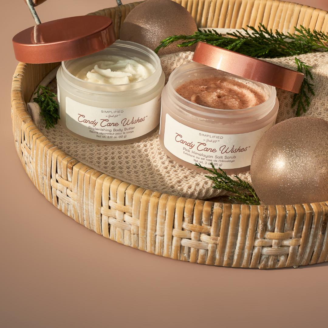 Celebrate the magic of winter with our Candy Cane Wishes™ Body Butter and Salt Scrub. This festive duo turns self-care into a joyful holiday ritual.  This collection is your ticket to glowing skin and holiday bliss.  Infused with our minty-sweet Candy Cane™ blend from the Simplified by Jacob + Kait™ line, this duo brings a touch of whimsy to your winter skincare routine. Pink Himalayan sea salt exfoliates and sloughs away dull, dry skin, while plant-based ingredients like mango seed butter deliver long-lasting moisture.