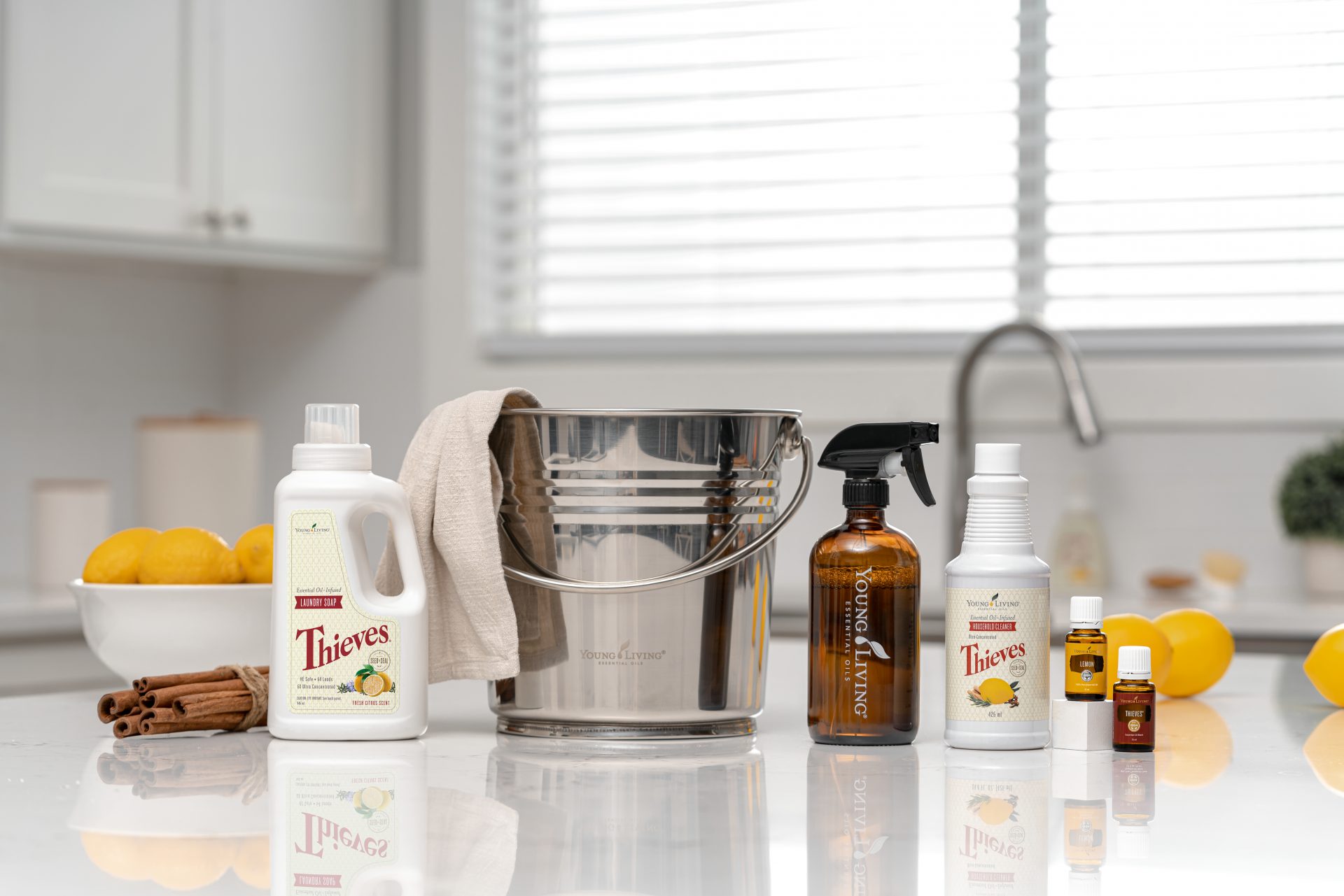 Begin with Thieves® Household Cleaner—you know it, you use it, and you love it. Transform your cleaning with the strength and versatility of Thieves by diluting at a 15:1 ratio with water. From countertops to floors, this easy-peasy DIY has got your kitchen covered.