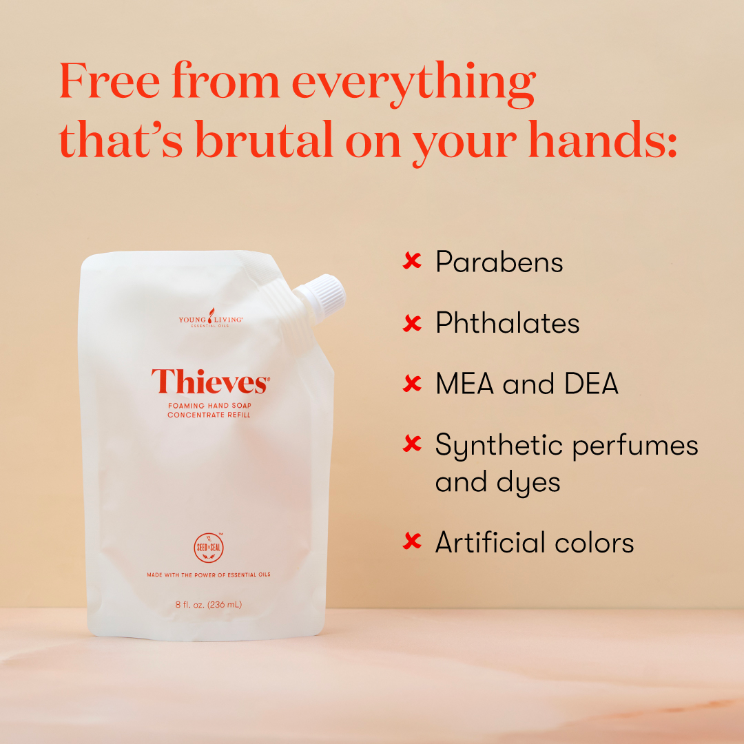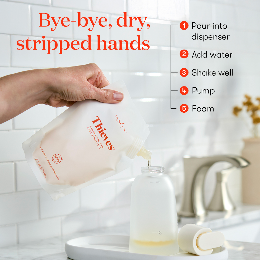 Make the low-tox switch today with Thieves® Foaming Hand Soap Concentrate—cleaner hands, cleaner home, less waste!