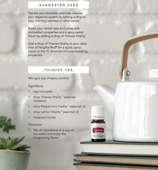 - Boost your herbal teas and juices with antioxident properties and a spicy-sweet flavor by adding a drop of Thieves Vitality.