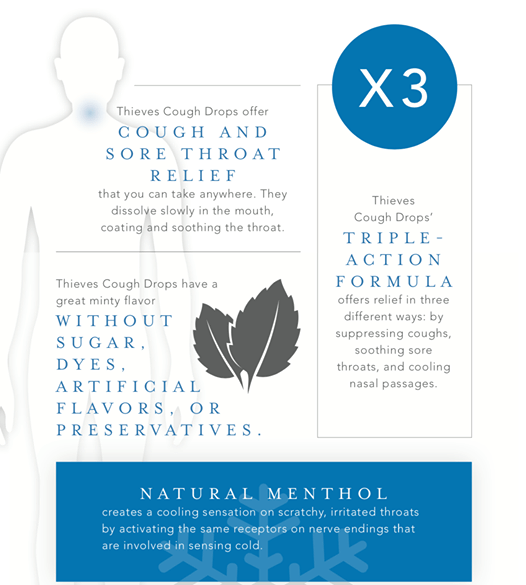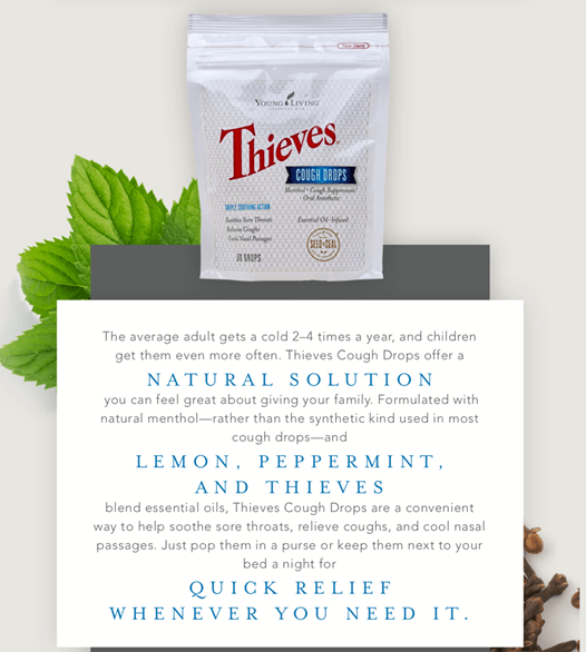 Do you have a sore throat or cough?  Young Living’s Thieves Cough Drops are formulated to help soothe sore throats, relieve coughs, and cool nasal passages.  These cough drops combine a variety of naturally derived ingredients, including naturally derived menthol, which aids in the cooling of nasal passages, and Young Living’s 100-percent pure, therapeutic-grade essential oils, Cinnamon, Clove, Lemon, Rosemary, Eucalyptus Radiata, and Peppermint, that provide a sweet and spicy flavor.